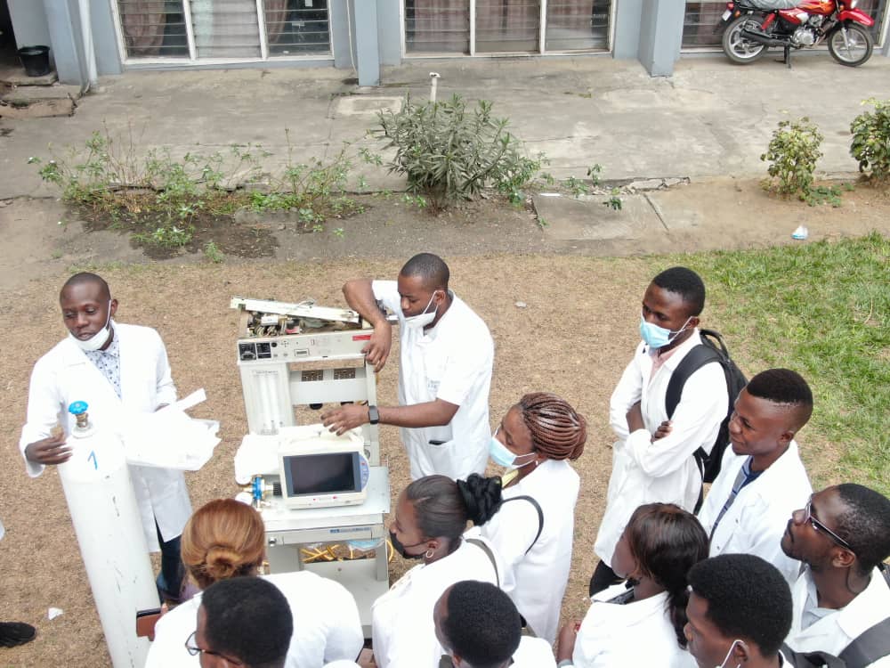Dr Ben KABWE du Cliniques Universitaires de Kinshasa avec les étudiants de la faculté de Médecine sur un enseignement pratique sur la manipulation des respirateurs.